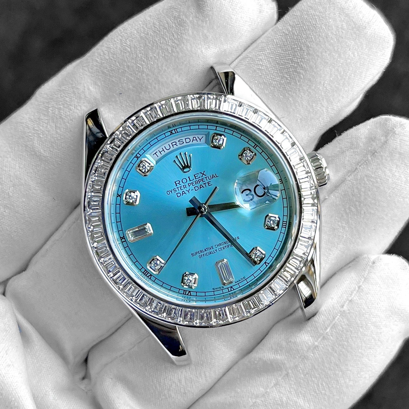 今回はブレスレットを外した状態でお預かりしたので、ヘッドのみのご紹介となりますが、まず、デイデイト36用のバゲットダイヤベゼルとプラチナモデルの占有カラーでもお馴染みのアイスブルー文字盤を製作致しました!