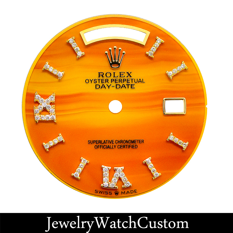 純正モデル同様の仕上がりとなり、6と9はアラビア、その他のバーにはダイヤモンドが留められており、金無垢のデイデイトをより鮮やかな仕様に生まれ変わらせてくれます♪