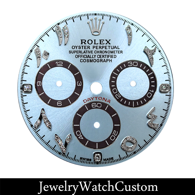 デイトナアイスブルー アラビア インデックス ダイヤモンド文字盤は、デイトナのCal.4130(キャリバー)を搭載したモデルであれば、どなたでも取付する事が可能となり、当店で取付もご希望の場合、約3日程度で組み上げまで行う事が可能です。